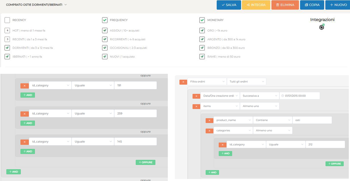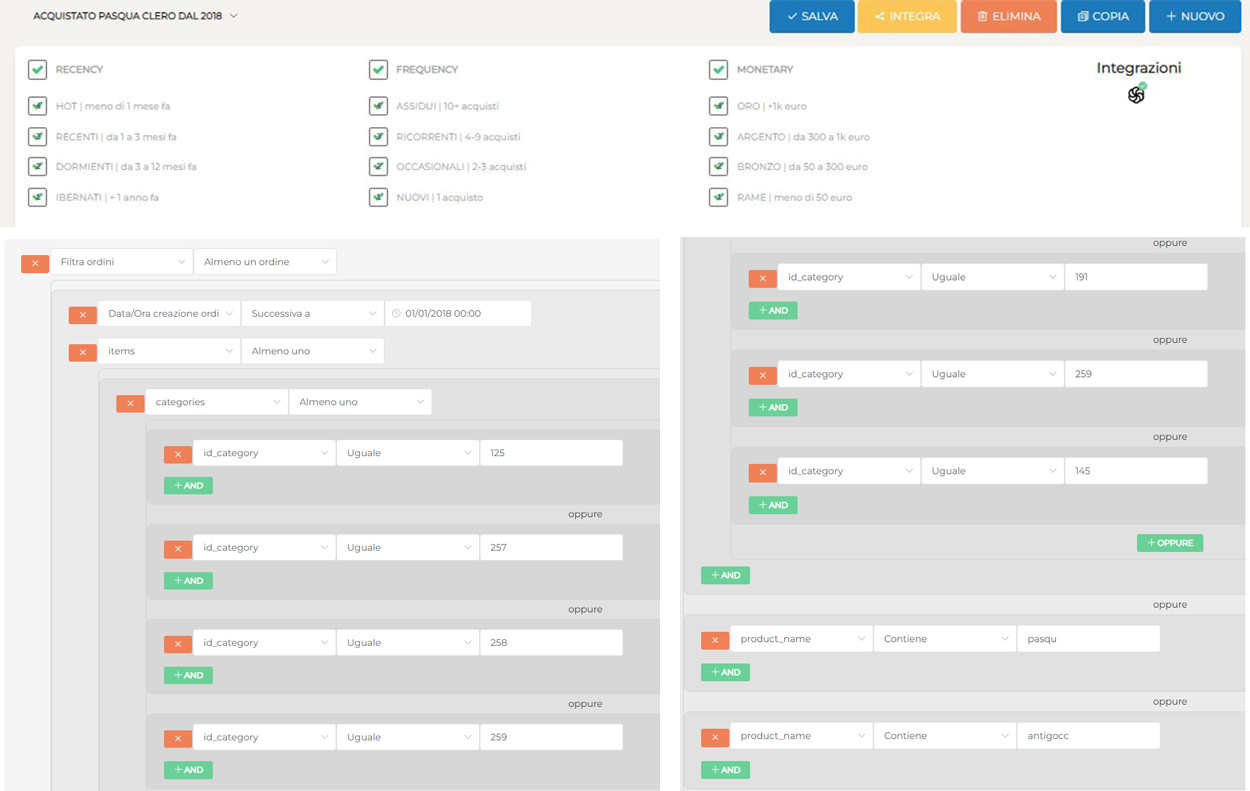 Il primo step è stato quello di impostare delle liste personalizzate basandoci sui parametri di RFMCube (tempo trascorso dall’ultimo acquisto, numero di acquisti e il totale speso). Abbiamo quindi creato:
